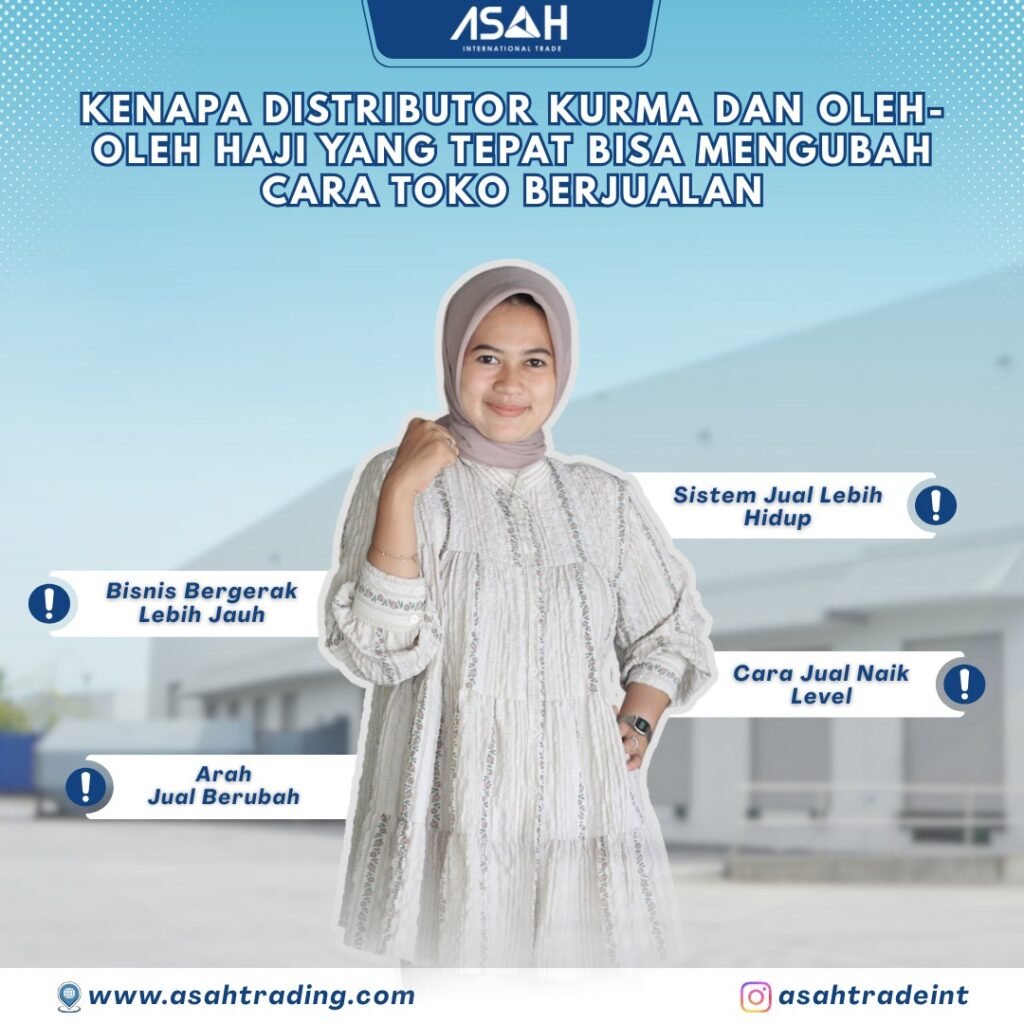 PT. ASAH International Trade menyalurkan berbagai produk kurma dan oleh-oleh haji dari sumber terpercaya menuju jaringan toko seluruh Indonesia. Pendekatan ini membantu toko fokus pada penjualan, sementara urusan suplai berjalan lebih tertata.